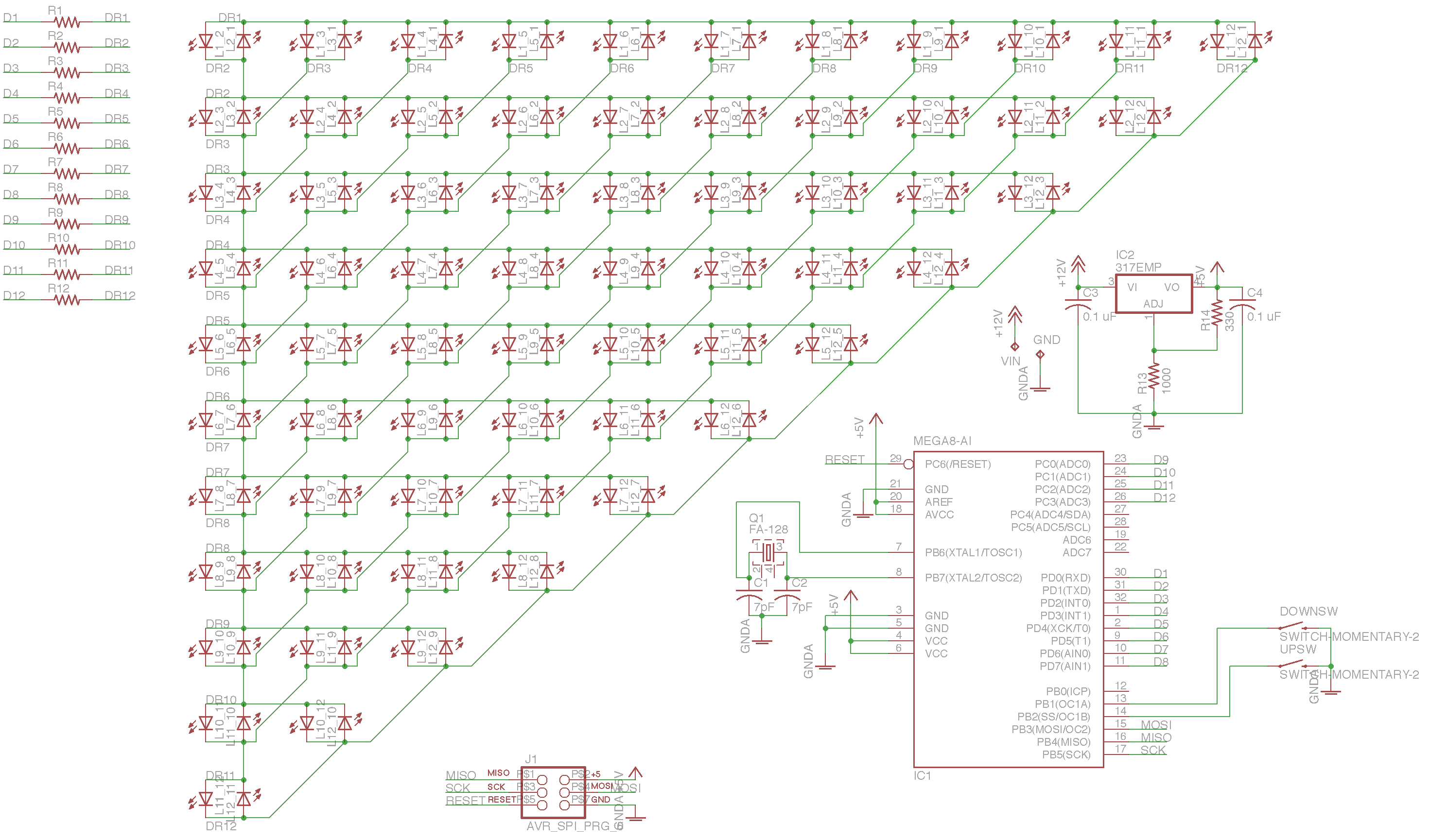 The ATMEGA is the centerpiece of the back of the board. Nearby is the 16MHz crystal, and to either side are the momentary switches that allow the setting of the time. The top edge of the board is the bank of current-limiting resistors needed to drive the LEDs. Finally, on the edges of the board, there’s a 6-pin ICSP programming header and your standard LM317 linear regulator circuit set up to output 5V.