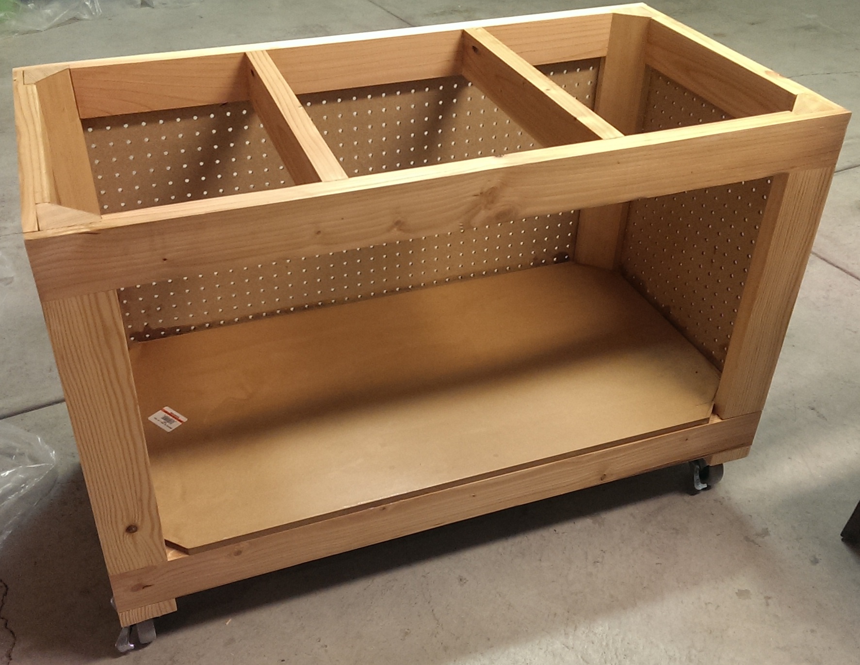 The bottom shelf is a piece of 1/2″ MDF, but the top of the bench is more exotic. It’s a 24″x48x4″ torsion box made from 1/2″ MDF, including the skins. Inside, there’s a grid of ribs on 6″ centers. The ribs fit together with half-lap joints as well, which I cut on my table saw’s crosscut sled with an improvised indexing jig to get reliable spacing. All together, this work top is probably the single sturdiest thing I’ve ever built, and it is not absurdly heavy. It’s exactly what I want to serve as the basis for my CNC. The torsion box is attached to the frame with a few brackets and screws. Put together, the cart has a very solid feel to it. Finally, there’s a set of locking casters on the bottom of the corner posts to make it mobile.