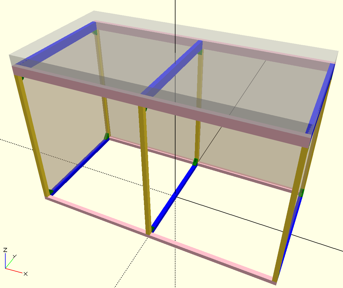 The design itself is very simple. The four corner posts are made of 4x4s resawn down to 3″x3″. All the horizontal beams are resawn 2x4s. Both the posts and beams have half-laps cut in their ends using my table saw’s crosscut sled and a dado stack. (The corner posts are half-lapped from two sides.) I added some midspan supports to make the top and shelf even sturdier; those are connected with glue and pocket screws. The rest is all just wood glue.