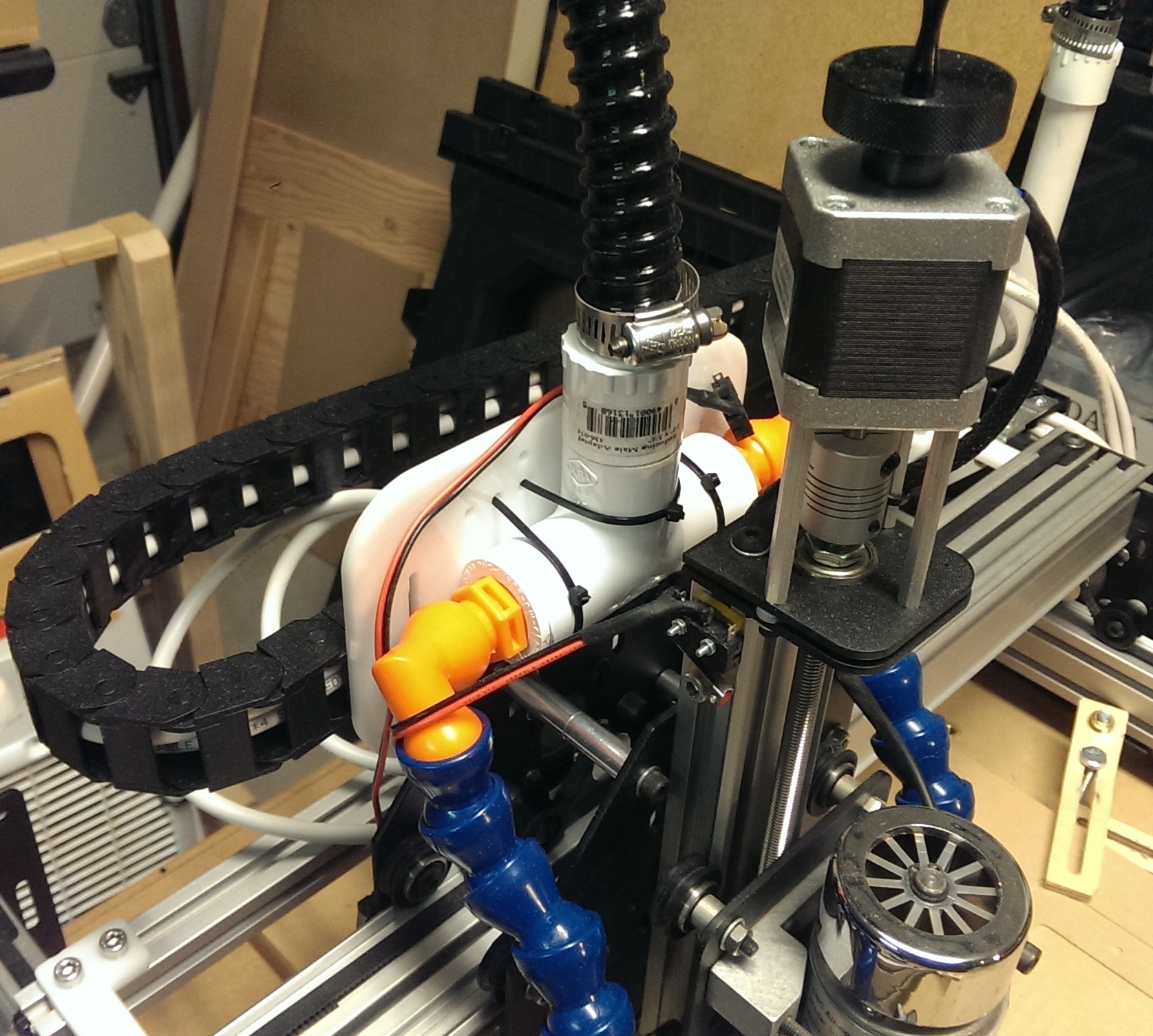 The PVC pipe tee on the X-carriage connects to a piece of corrugated hose, which connects to a tall piece of pipe bracketed to the side of the cart. That goes all the way down to the foot of the cart and to an adapter that my shop-vac’s hose can plug right into. It works great! The only thing I would change would be to use larger diameter PVC pipe – the shop vac sounds like it’s struggling a bit due to the constriction of the current setup.