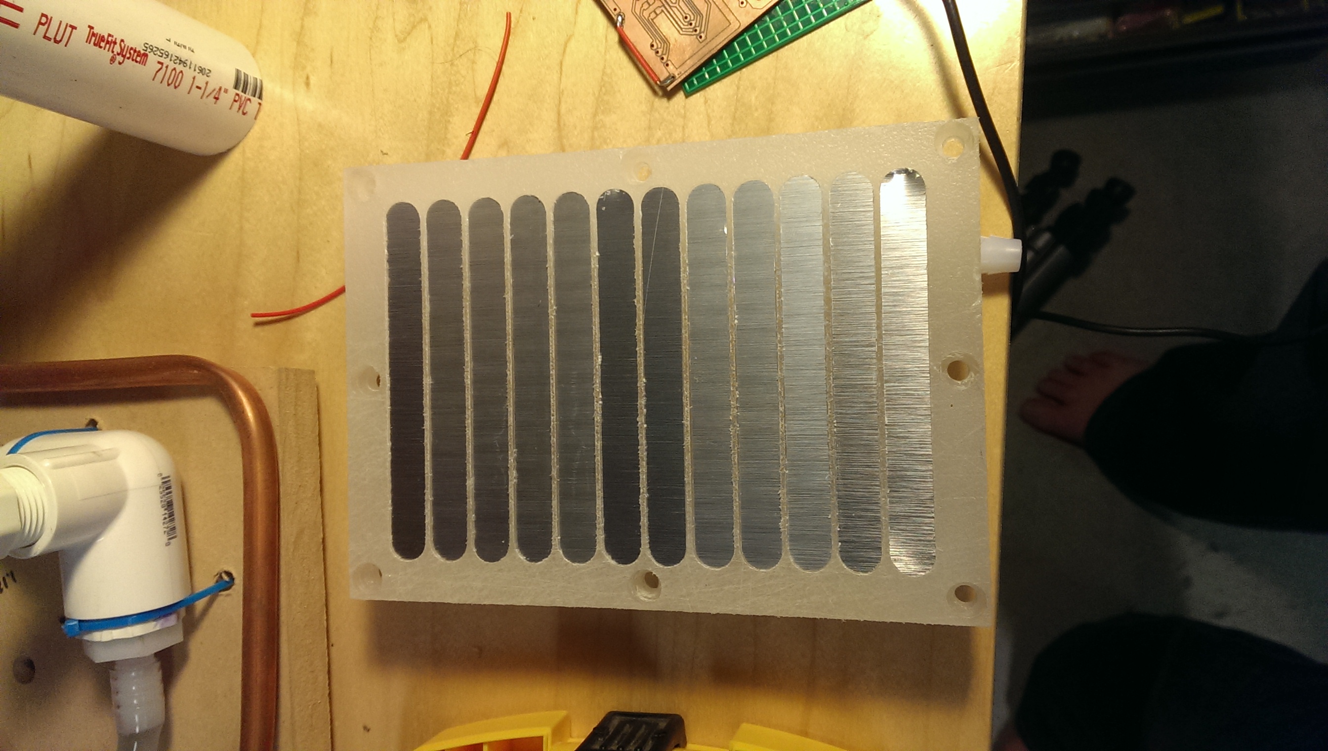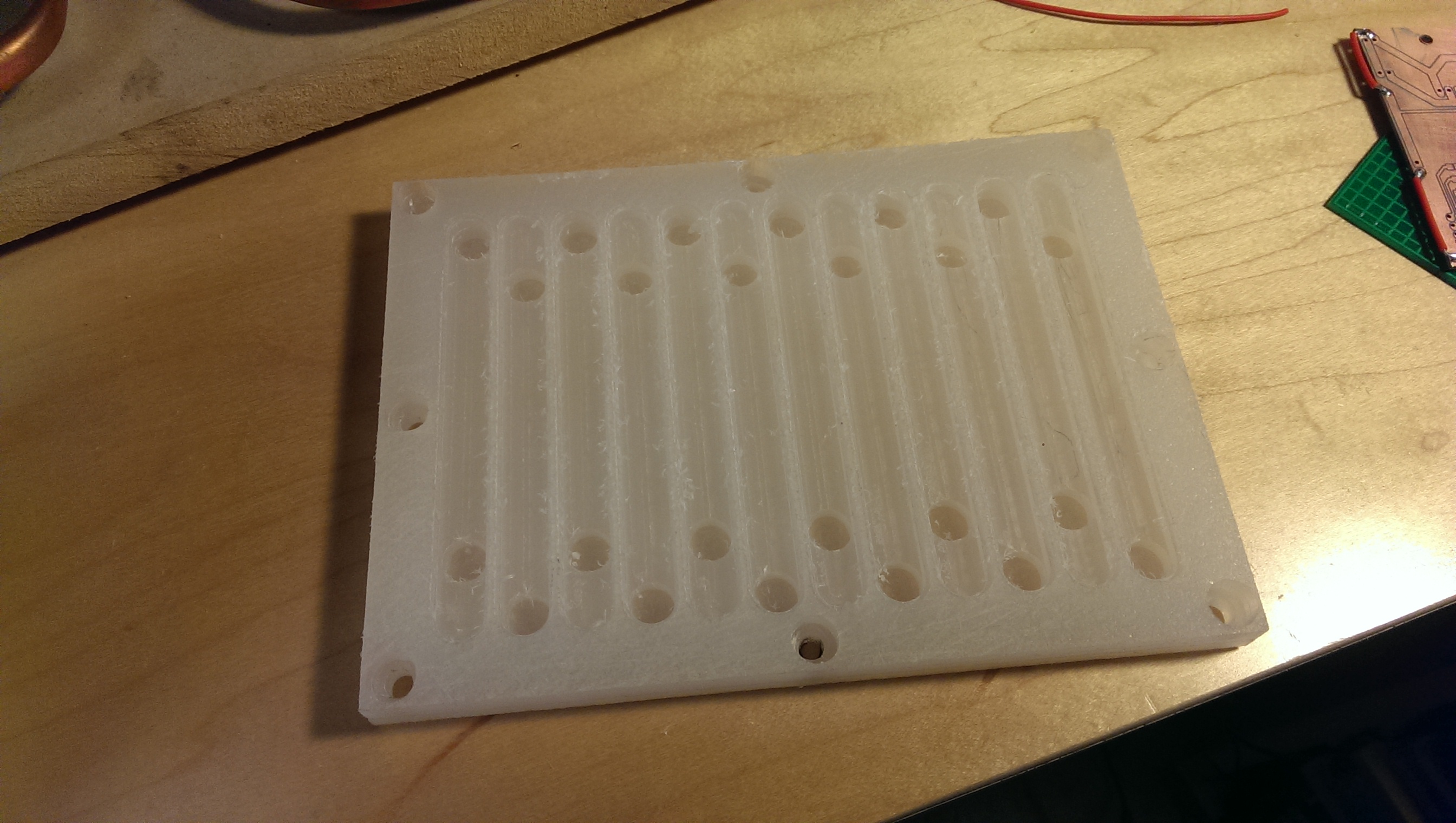 Replacing the clunky “copper tubes through a 2×4″ test grill was high on my list of priorities, so I tackled that first. I considered a number of different options, but settled on making a custom one-piece grill out of a 1/2″ HDPE cutting board. Essentially, it’s like a two-sided PCB, except instead of copper traces and plated vias, I milled width-wise grooves into the top and length-wise grooves into the bottom with through-and-through holes connecting the two sides. The result is a sort of channel that snakes across the top, through to the bottom, over the neighboring groove, then back to the top. To make it capable of moving water, I capped the grooves with pieces of 0.025” aluminum sheet, also cut out on the Shapeoko 2. The first and last hole of each path are threaded to accept a hose barb.