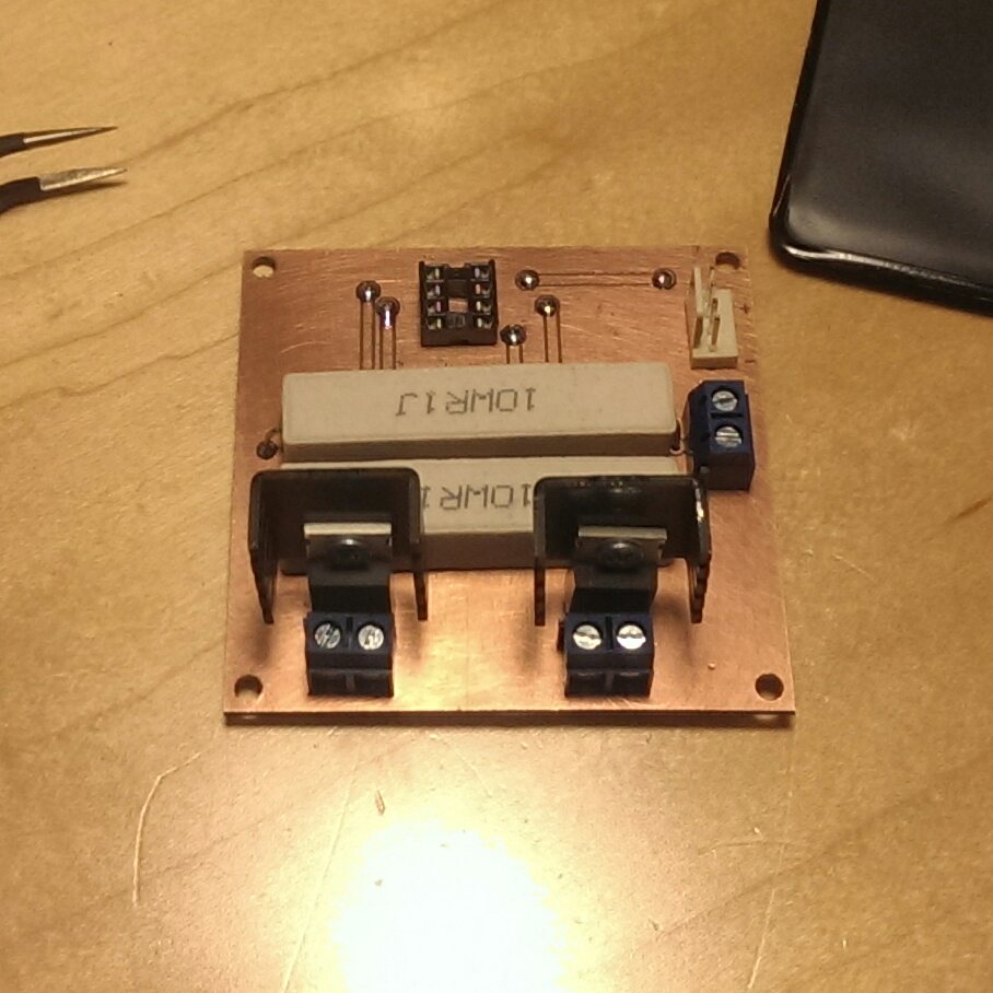 In rev 1, I made a small order of magnitude math error and incorrectly sized my power resistor, thus dissipating about 10x my desired wattage in the resistor. (It’s hard to appreciate what it means when these things are rated as “fire proof” until your IR thermometer reads 300 degrees C.)