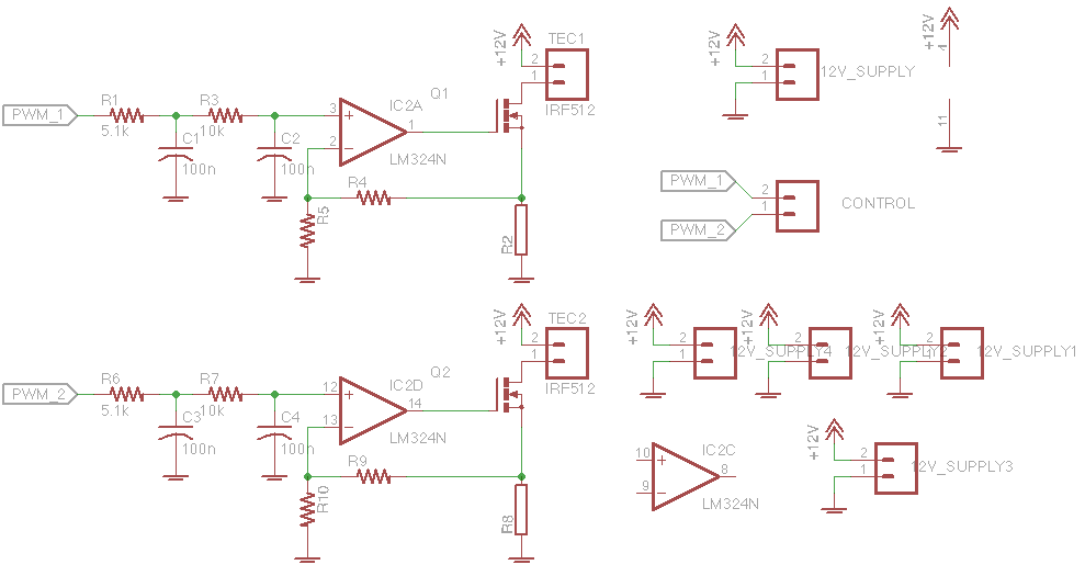 The TEC controller, though, is where things get difficult. Coming from an Arduino, PWM is easy, but TEC efficiency is greatly reduced when controlled in this fashion. To get analog control of TEC current, I designed a PWM-to-constant-current converter board. The basic principle of operation is to use an op-amp, MOSFET, and power resistor to form a feedback-controlled current sink. Then, rather than using a potentiometer to set target current, I’m using the PWM output of an Arduino plugged into an RC lowpass filter. The filter converts the PWM into an analog voltage, which is converted into the target current by the op-amp feedback network.