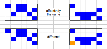 It’s hard to be 100% sure if I took the same approach as Duparc, since his original research paper is written in French. The way my algorithm works is to divide the grid in half vertically again and again until I’m working with single columns, at which point I essentially rotate the column into a row apply the same subdivision algorithm again until I reach a single cell. Single cells – both alive and dead – have a nice, cacheable method for determining all their prior states. Once I have the partial answers for a single cell, I intersect them with the answers from the neighboring cell by checking the overlap between the two. If the cells shared by the two possible solutions match, then the combined solution is also viable. Partial solutions that don’t match neighbors are discarded. This same process of merging based on overlapping cells continues back up the search tree until we reach the root, at which point we have a set of possible prior generations.